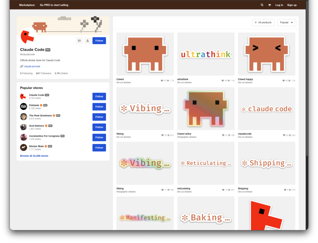 Claudeのキャラクターや「*Vibing…」等のClaude Codeに作業させている時に表示される文言のものがあります。PCに貼るのにぴったりです。